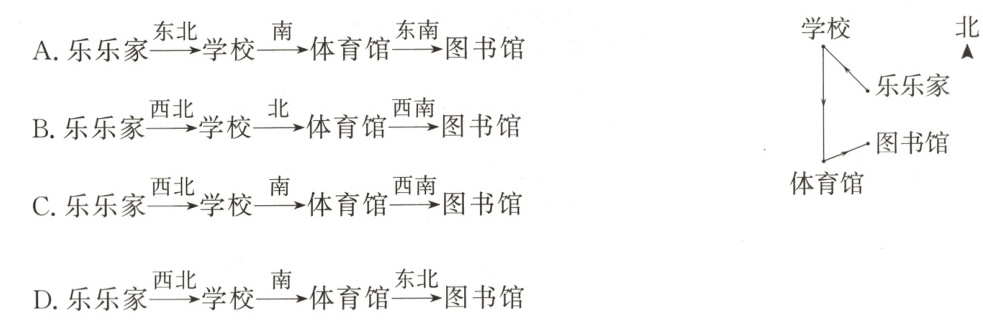 (2)如图,科技馆的西南方向是图书馆,图书馆的东面是学校,学校在科技馆的( )方向。