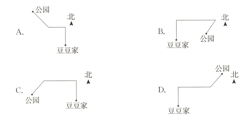 5. 豆豆从家出发,先向北走一段路,接着向东走一段路,最后向西南走一段路,就到了公园。可以表示豆豆从家到公园的路线图是( )。