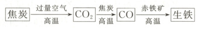 $C + O_{2}\stackrel{高温}{=\!=\!=}CO_{2}$ $CO_{2} + C\stackrel{高温}{=\!=\!=}2CO$ $Fe_{2}O_{3} + 3CO\stackrel{高温}{=\!=\!=}2Fe + 3CO_{2}$