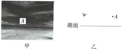12.(2024长沙三模)茶卡盐湖是我国四大盐湖之一,有“天空之镜”的美称。研学小组去茶卡盐湖旅游时,看到平静的湖面上小鸟(A点)自由地翱翔(如图甲所示)。请你在图乙(简化图)中画出人眼通过湖面看到小鸟的像(A'点)的光路图。