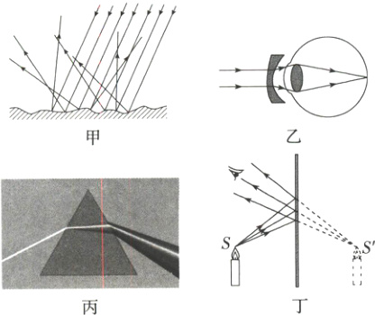 D漫反射的光线尽管杂乱无章,但每条光线仍然遵循光的反射定律,故A错误;图乙中,人佩戴的凹透镜可以矫正近视眼,故B错误;白光通过三棱镜时,因为不同颜色的光从空气进入玻璃时偏折程度不同,故白光被分解成红、橙、黄、绿、蓝、靛、紫七色光,红光的偏折程度最小,故C错误;平面镜成像是由光的反射形成的,故D正确。