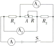 解析 由图可知,三个电阻并联接入电路,电流表$A_1$测通过$R_1$和R的电流,电流表$A_2$测通过$R_2$和R的电流,电流表A测量通过三个电阻的总电流;并联电路干路电流等于各支路电流之和,电路总功率为26.4W,则干路电流$I = I_1 + I_A + I_2=\frac{P}{U}=\frac{26.4W}{12V}= 2.2A$,并联电路各支路两端电压相等,根据欧姆定律可得通过两定值电阻的电流之比$\frac{I_1}{I_2}=\frac{\frac{U}{R_1}}{\frac{U}{R_2}}=\frac{R_2}{R_1}=\frac{2}{1}$,滑片置于中点A处时,电流表$A_1$、$A_2$示数之比为8 : 5,即$\frac{I_1 + I_A}{I_A + I_2}=\frac{8}{5}$,可得:$I_1 = 1.2A$,$I_2 = 0.6A$,$I_A = 0.4A$,根据欧姆定律可得滑动变阻器的最大阻值$R=\frac{U}{I_A}×2=\frac{12V}{0.4A}×2 = 60Ω$。