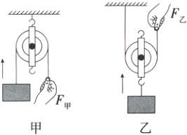 C 物体重力均为5N,滑轮重1N,乙图中是动滑轮,省一半的力,则拉力F乙 = 3N,故A错误;两物体的重力相等,提升高度相同,则两图中做的有用功相等,故B错误;因绳重和滑轮摩擦不计,所以甲图中定滑轮的机械效率为100%,而乙图在提升重物的同时提升动滑轮做功,有额外功存在,所以乙图中的机械效率小于甲图,故C正确;两物体在相同时间内被提升相同的高度,即有用功相等,乙图中机械效率小,则乙图中所做的总功大,根据P = $\frac{W}{t}$可知,乙图中F乙做功的功率大,故D错误。