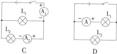 D A选项中两灯泡并联,电流表接在干路,测量的是干路电流,不能直接测量通过灯L₁的电流,故A不符合题意;B选项中两灯泡并联,电流表位于L₁支路,但电流表的正、负接线柱接反了,不能测量通过灯L₁的电流,故B不符合题意;C选项中两灯泡并联,电流表A₁接在干路,测量干路电流;电流表A₂接在L₂所在支路,测量通过灯L₂的电流,利用并联电路的电流特点可求出通过灯L₁的电流,但不能直接测量通过灯L₁的电流,故C不符合题意;D选项中两灯泡并联,电流表位于L₁支路,且电流表的正、负接线柱连接正确,能直接测量通过灯L₁的电流,故D符合题意。