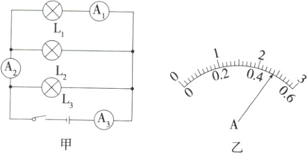 (1)由电路图可知,三灯并联,电流表A₁测通过L₁的电流,电流表A₂测通过L₁和L₂的电流之和,电流表A₃测干路电流。因为电流表A₁、A₃的指针偏转角度均如图乙所示,所以电流表A₁选择0~0.6A量程,电流表A₃选择0~3A量程,则由电流表A₁的示数即通过L₁的电流I₁ = Iₐ₁ = 0.48A,电流表A₃的示数I = 2.4A,电流表A₂的示数Iₐ₂ = I - I₃ = 2.4A - 1.2A = 1.2A;
