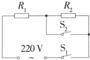 解析 当开关$S_1$、$S_2$都闭合时,只有$R_1$工作,电路中的总电阻最小,由$P=\frac{U^2}{R}$可知此时总功率最大,电加热器处于高温挡。电加热器在该挡位下正常工作5min产生的热量$Q=\frac{U^2}{R_1}t=\frac{(220V)^2}{44Ω}×5×60s = 3.3×10^5J$。