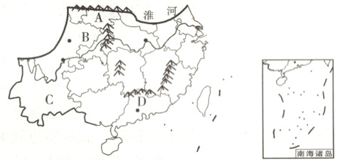 (2)C为______高原,地形崎岖,石灰岩分布广泛,其中______省是中国少数民族最多的省级行政单位;D为______(城市),别称“羊城”,为广东省省会,是珠江三角洲区域的中心城市,通过从境外引进资金、技术与管理模式,该区域的______型经济得到迅猛发展。