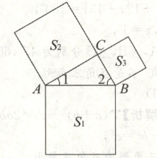 90 【解析】$\because S_{1}=3,S_{2}=2,S_{3}=1$,$\therefore AC^{2}+BC^{2}=AB^{2}$,$\therefore∠ACB = 90^{\circ}$,$\therefore∠1 + ∠2 = 180^{\circ}-90^{\circ}=90^{\circ}$.故答案为 90.
