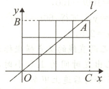 7.$y = \frac{9}{10}x$[解析]设直线$l$和八个正方形的最上面交点为$A$,过点$A$作$AB\perp y$轴于点$B$,过点$A$作$AC\perp x$轴于点$C$,如图所示$\because$正方形的边长为1,$\therefore OB = 3$. $\because$经过原点的一条直线$l$将这八个正方形分成面积相等的两部分,$\therefore$两边分别是4,$\therefore$三角形$ABO$面积是5,$\therefore\frac{1}{2}OB\cdot AB = 5$,$\therefore AB = \frac{10}{3}$,$\therefore OC = \frac{10}{3}$,$\therefore$点$A$的坐标为$(\frac{10}{3},3)$.设直线$l$的解析式为$y = kx$,$\because$点$A(\frac{10}{3},3)$在直线$l$上,$\therefore 3 = \frac{10}{3}k$,解得:$k = \frac{9}{10}$,$\therefore$直线$l$解析式为$y = \frac{9}{10}x$.故答案为$y = \frac{9}{10}x$.