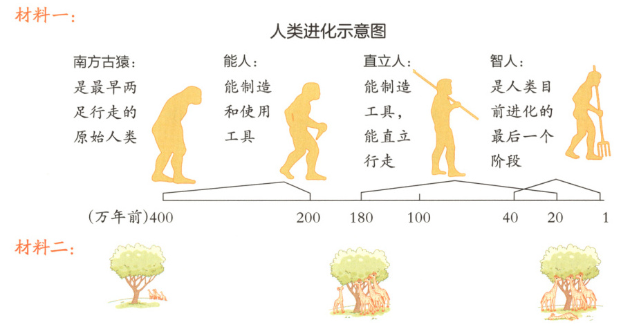 [点拨]本题考查理解材料内容的能力。材料一是人类进化示意图,材料二是长颈鹿的进化过程。由此可知,这两则材料共同的主题是进化。