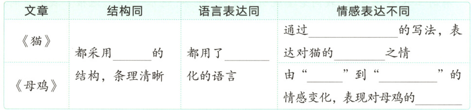 四 新考法·表文转换 典典通过封底知道了《猫》和《母鸡》都是老舍的作品。请你帮他梳理异同。