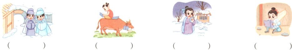 五 在展区,同学们开展了勤学故事展演活动,下面是他们的宣传海报中的图片,请你根据图片,猜一猜他们展演了哪些故事,并填一填。