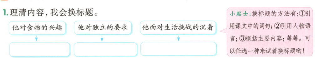 [点拨]本题考查换小标题的能力。全文以“我们家的男子汉”为中心,分别写了男子汉从不挑食、走路不需要人牵手、自己购物、上托儿所、被送回安徽等事情。换小标题时,可借助小贴士的提示,尝试用多种方法来概括本文每个部分的主要内容。