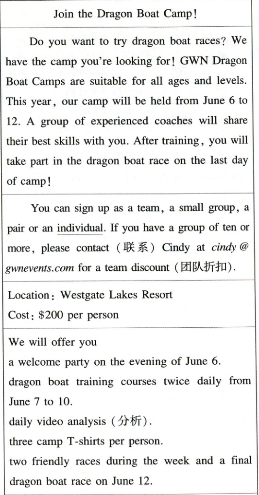 3.Which picture shows the meaning of the underlined word “individual”?4.What can't we do in the Dragon Boat Camp according to the text?