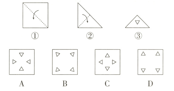 6. 新素养 几何直观 把一张正方形纸按下图的方式对折后,剪去一个三角形,展开后得到的图形是( )。