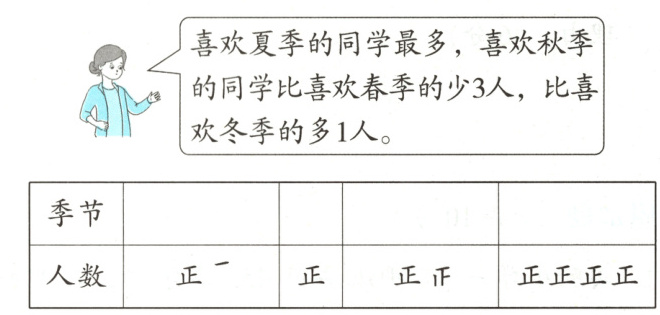 3. 一年有四季:春夏秋冬。下面是郑老师对二(1)班同学喜爱四季情况进行的统计,你能根据提示在表中写下对应的名称吗?