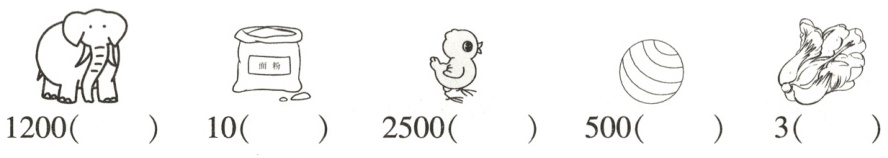 6. 一袋盐约重500( ),( )袋约重1千克,1千克=( )克。