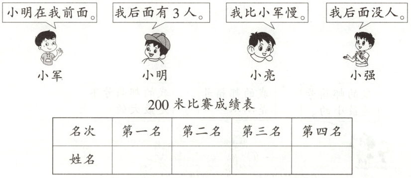 2. 小军、小明、小亮、小强四人参加了学校运动会200米赛跑。你知道他们的名次吗? (填姓名)(8分)