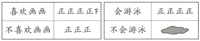 9. 妙妙用画“正”字法调查了班上同学的兴趣爱好情况,妙妙班上一共有( )名同学,其中不会游泳的有( )人。