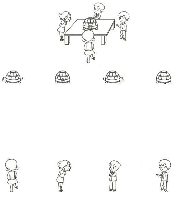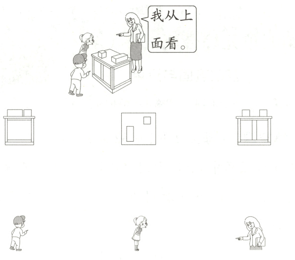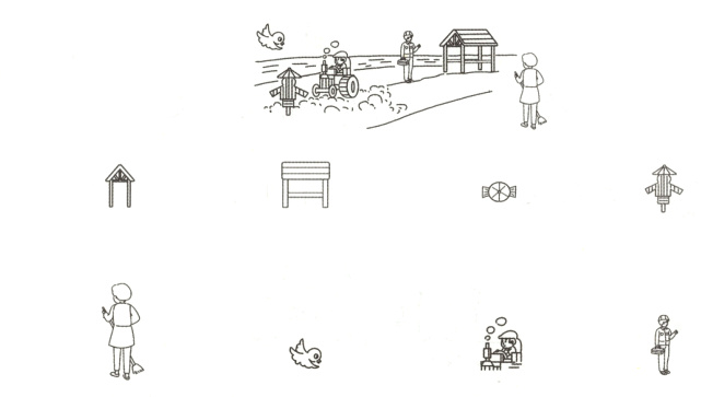 提示:题图中物体、人物较多,要仔细观察。稻草人在题图的左半部分,坐在拖拉机上的人和天空中的小鸟可以看到稻草人。同样,题图的右边有两个人,他们可以看到木棚。