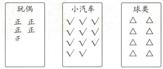 三、老师统计了二年级部分同学最喜欢的玩具情况,每人只选择一种,结果如下。(每题3分,共15分)
