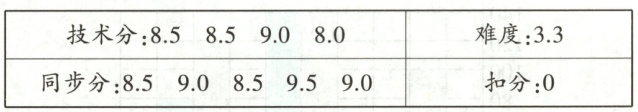 计算基础分时,将2名选手的4个技术分中,去掉一个最高分,去掉一个最低分;在5个同步分中,去掉一个最高分,去掉一个最低分。剩下的分数相加后,再除以5乘3,得到基础分。