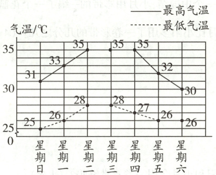 (2)星期( )的最高气温与最低气温相差最大,星期( )的最高气温与最低气温相差最小。(4分)