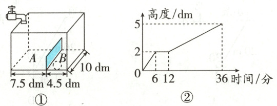 7. 有一个长方体容器(如图①),现以每分25 L的速度向这个容器注水。容器的底面有一块隔板(垂直于底面,不考虑厚度),将容器隔为A,B两部分。B部分的底部有一个洞,水按每分10 L的速度往下漏。图②表示从注水开始A部分水的高度变化情况。(9分)