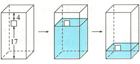 2. 底面积:$832÷(17 - 4) = 64(cm^{2})$ 高:$17 + 4 + 2 = 23(cm)$ 容积:$64×23 = 1472(cm^{3}) = 1472 mL$ 答:这个容器最多能装1472 mL的水。提示:首先根据题意可得减少的水的体积是底面积相同的长方体的体积,所以减少的水的体积可以装满与容器底面积相同且高为$17 - 4 = 13(cm)$的长方体,所以底面积为$832÷(17 - 4) = 64(cm^{2})$,长方体的高为$17 + 2 + 4 = 23(cm)$,所以长方体体积为$64×23 = 1472(cm^{3})$,即容器最多能装1472 mL的水。