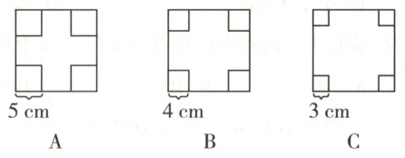 5. 在边长为16 cm的正方形纸片的四个角各剪去一个大小相等的正方形,就可以做成一个没有盖的长方体纸盒。按如图A,B,C三种方法做出来的纸盒中,容积最大的是哪一个?(5分)