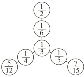 1. 将$\frac{1}{2}$,$\frac{1}{3}$,$\frac{1}{4}$,$\frac{1}{5}$,$\frac{1}{6}$,$\frac{5}{12}$,$\frac{7}{15}$分别填入下图的