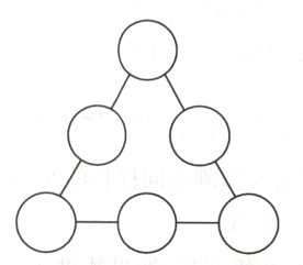 2. 把$\frac{1}{10}$、$\frac{1}{5}$、$\frac{3}{10}$、$\frac{2}{5}$、$\frac{1}{2}$、$\frac{3}{5}$填入下图中的六个圆圈内,使每条线上三个数的和都相等。(5分)