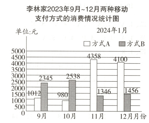 (4)答:李林家10月方式B消费最多,11月方式A消费最多。(答案不唯一)