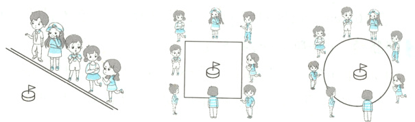 第三种方式最公平。理由:第一、二种方式中各同学距离目标的远近不一样,所以不公平;第三种方式中同学围成一个圆,目标在圆心上,各同学与目标的距离都等于半径长,同一个圆的半径相等,也就是各同学与目标的距离都相等,所以最公平。(合理即可)