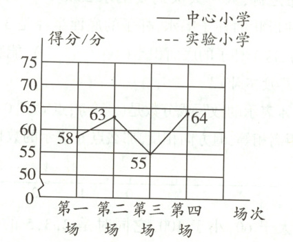 6. 如图是某市中心小学和实验小学篮球队的四场比赛得分情况统计图,其中实验小学的第一场比赛得55分,第四场比赛得72分。(6分)