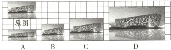 4. 我国的国家体育场“鸟巢”,是全球第一个“双奥体育场”。下面方格图中关于“鸟巢”的四幅图,由原图按照一定的比放大或缩小得到的是图( )。