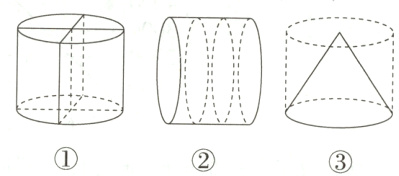 1. 将一个圆柱形木块沿底面直径切成相等的四部分(如图①),表面积增加48 cm²;若将圆柱形木块沿与底面平行切成三个小圆柱(如图②),则表面积增加50.24 cm²。现在把这个圆柱形木块削成一个最大的圆锥(如图③),体积减少多少?(5分)