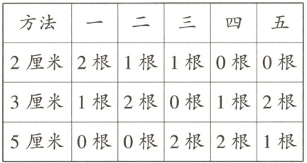 1. 从下面六根小棒中每次选出三根,首尾相接围成一个三角形,一共可以围成多少个不同的三角形?在表中填一填。(4分)