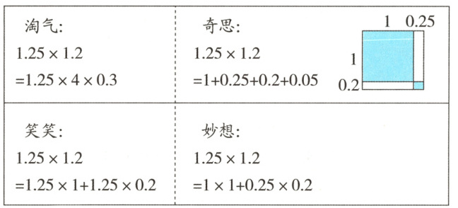 5. 新趋势 算理理解 在计算1.25×1.2时,下面的想法中有( )种是正确的。