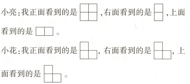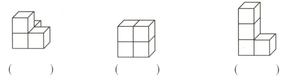 2. 小乐、小亮、小花分别用四个小正方体拼搭立体图形。下面是他们从立体图形的正面、上面、右面观察到的图形,根据拼的立体图形在括号里填上对应的名字。(6分)