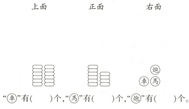 2. 新素养 空间观念 一些象棋棋子混在了一起,小红要从中整理出一副象棋。她先将相同的棋子叠在一起,从三个方向观察得到的图形如下。请先将观察方向和对应图形连起来,再写出这三种棋子各有多少个?(6分)