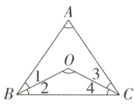 提示:$\angle2+\angle4 = 180^{\circ}-\angle O = 180^{\circ}-125^{\circ}= 55^{\circ}$,$\angle ABC+\angle ACB = \angle1+\angle2+\angle3+\angle4 = 2(\angle2+\angle4)= 110^{\circ}$,$\angle A = 180^{\circ}-(\angle ABC+\angle ACB)= 70^{\circ}$。