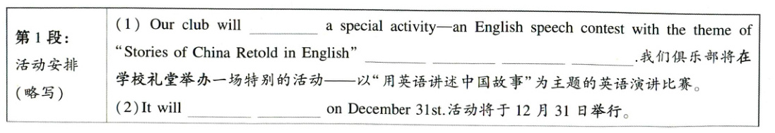 Our club will hold a special activity−an English speech English speech contest with the theme of contest with the theme of “Sttories of China Retold in English" in “Stories of China Retolld in English” in the the school hall, which will take place on December 31st.①