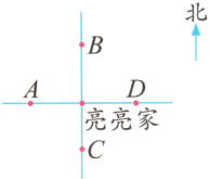 如图,商场在亮亮家的北面,学校在亮亮家的西面,游乐场在商场的南面,图书馆在学校的东面。图书馆位于点( )处,游乐场位于点( )处。(填字母)