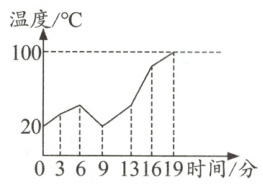(1) 炉子中途熄灭了( )分钟,水温大约下降到( )°C。