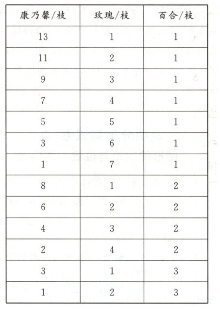 1. 李欣在“母亲节”这天拿出20元钱到花店买鲜花送给妈妈。如果她用全部的钱买价格表中的3种花配成一束,那么每种花可各买几枝?有几种方案?(7分)