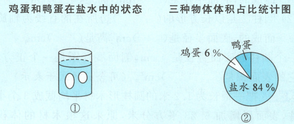 观察记录:鸡蛋和鸭蛋都悬浮在水中,如图①。三种物体体积占比情况如图②。