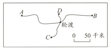 3. 王叔叔上午8:00驾车从轮渡出发去某地游玩,如果以每小时60千米的速度行驶,那么上午10:00可到达目的地。该目的地最有可能是下图中的( )地。