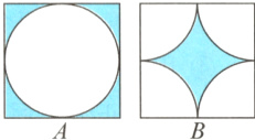 D [解析:设题中图A和图B中正方形的边长为a,则图A涂色部分的周长 = 正方形的周长 + 以a为直径的圆的周长,即4a + πa;图B涂色部分的周长 = 以a为直径的圆的周长,即πa。由此可知图A和图B涂色部分的周长不相等。图A和图B中涂色部分面积均等于正方形的面积减去以a为直径的圆的面积,所以图A和图B涂色部分的面积相等。]