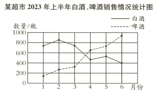 2. 下面是某超市2023年上半年白酒、啤酒销售情况统计图。